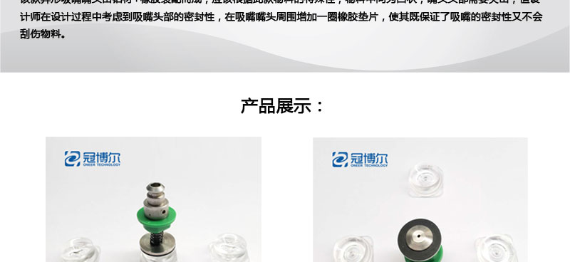该款异形吸嘴嘴头由铝材+橡胶装配而成,应该根据此款物料的特殊性,物料中间为凹状,嘴头头部需要突出,但设计师在设计过程中考虑到吸嘴头部的密封性,在吸嘴嘴头周围增加一圈橡胶垫片,使其既保证了吸嘴的密封性又不会刮伤物料。