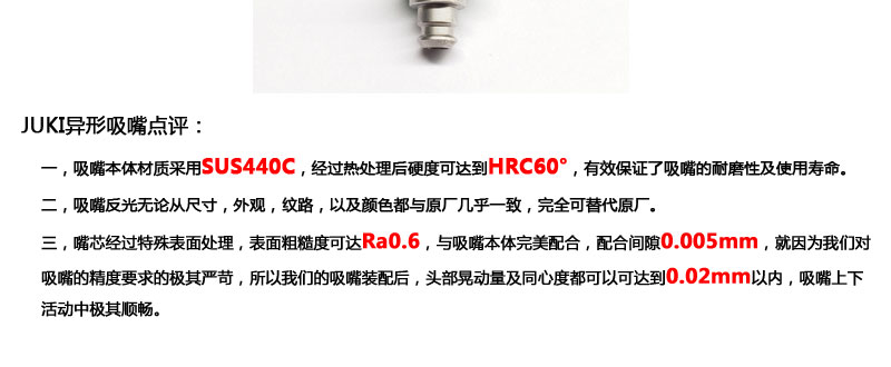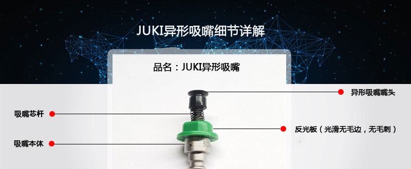 此款JUKI异形吸嘴,用于吸取物料的表面太过于光滑,用金属吸嘴头部吸取的话摩擦度不够容易拋料,所以我们把吸嘴头部改用橡胶吸盘,以此解决取料问题。
