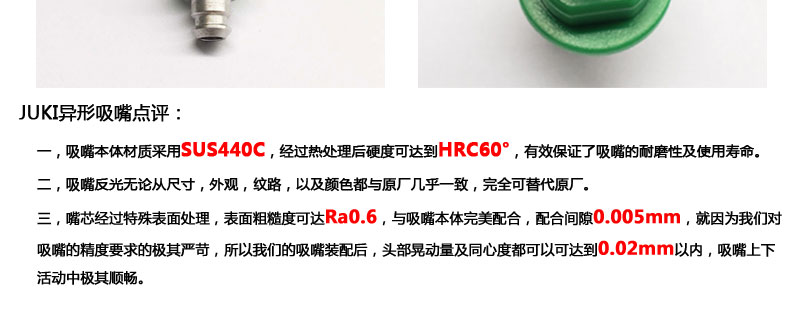 此款JUKI异形吸嘴用于吸取球面灯珠,吸嘴中间为凹状,取料时吸嘴头部是罩住元器件吸取,提高吸取的稳定性,降低拋料率。