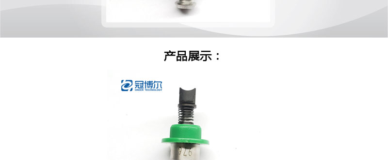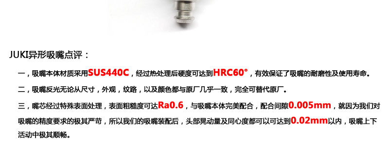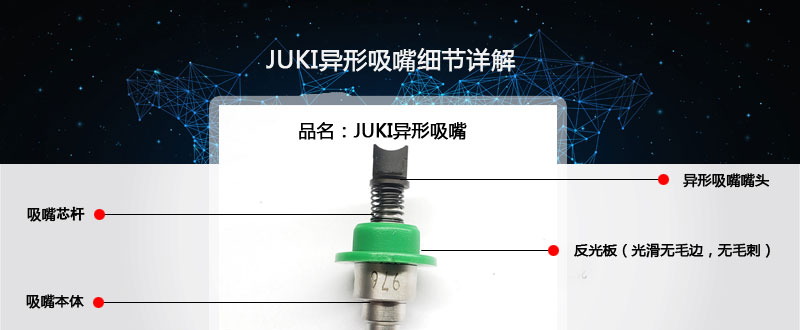 此款JUKI异形吸嘴是用于吸取二极管,头部呈半圆形,吸取元器件时更贴合,提高吸取的稳定性。